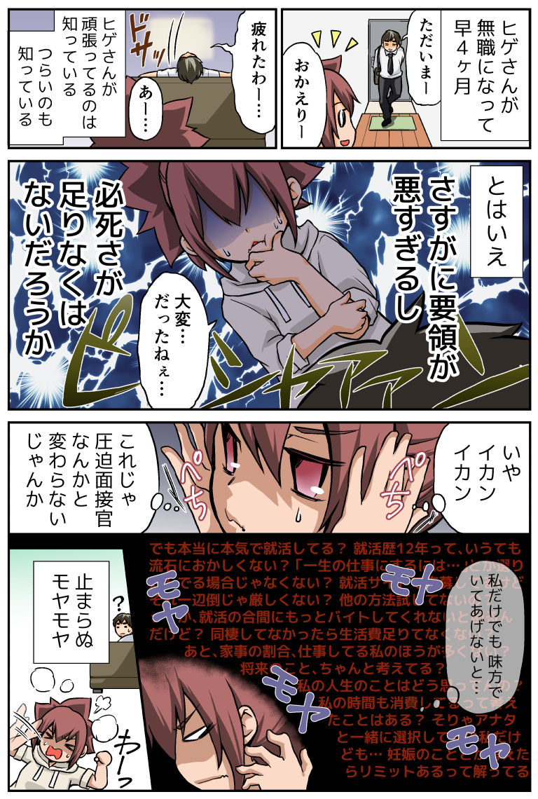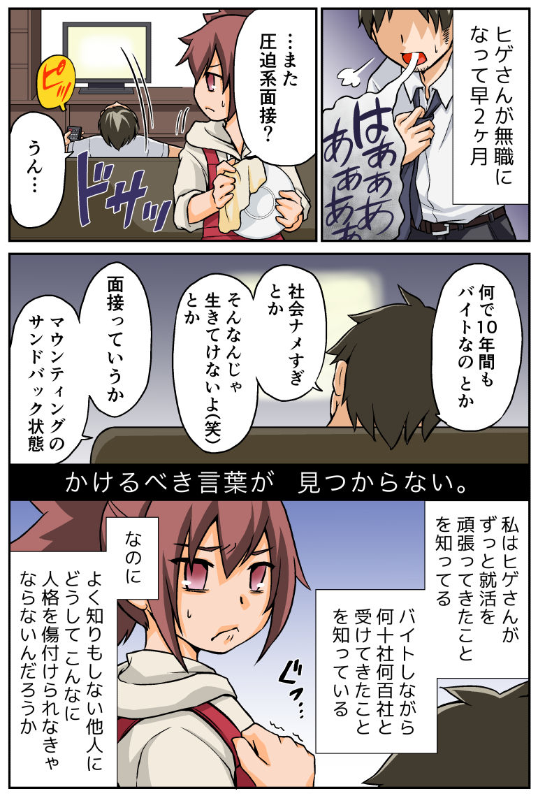 2019年08月21日 【プロポーズ編6】就職活動の闇 ◆前の話を読む◆ ◆このシリーズを最初から読む◆それでは本編です!みるみるウツになっていくヒゲさん…私たちはいわゆる『就職氷河期世代』。企業は軒並み採用を控え、大卒新卒でも就職浪人がバッサバサと出た世代。高卒のヒゲさんは、正社員採用を求め、足しげく就職活動をしたものの全く引っかからず。これまで非正規雇用で生計を立ててきました。私と暮らすまでは、父子家庭のため、中学生の頃から家事を全てこなし、働くお父さんを支えていて。決してニートだったわけでも、社会をナメていたわけでもありません。それなのに。仕事が欲しいから、面接に行っているのに。どうして、まるで社会不適合者のような扱いを受けて、罵られなきゃいけないのか。どんどん鬱々としていくヒゲさんを見ていて、リカバリーの効きにくい世の中なのだと、心底、落ち込んでしまいました。暗い話題でスミマセン…!夫婦カテゴリは、しばしツラいターンが続くことをご容赦ください(>人<)先日、政府が『就職氷河期世代支援プログラム』というのを打ち出したようですね。今さら感でいっぱいで不安だけど、切に期待しております…! たのむよ…!!◆次の話はコチラ→彼氏の長引く無職生活にモヤモヤが止まらない+++++++++++++++++++★★訪問ありがとうございます!★★ゆるゆると更新を続けてまいりますので、また遊びに来てもらえたら嬉しいです♪↓ LINEで更新通知を受け取れます